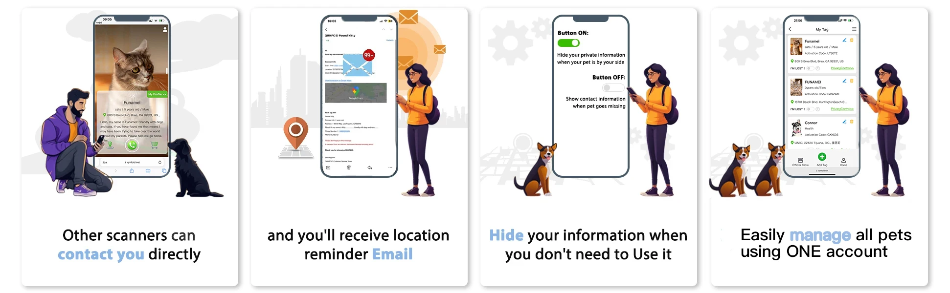 【Setup & Use】 Scan the QR code to activate the tag.Link to profile page containing important information about pet, you can edit emergency contact, name, photos, home address and medical history. It is easy to manage and update the information stored on it when your address and phone number changes.