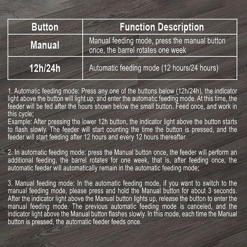 4. Deux modes d'alimentation sont disponibles : manuel (une simple pression sur le bouton « Manuel ») ou automatique (une simple pression sur le bouton « 12 h/24 h » ci-dessous). L'alimentation se fera alors toutes les 12 h/24 h.