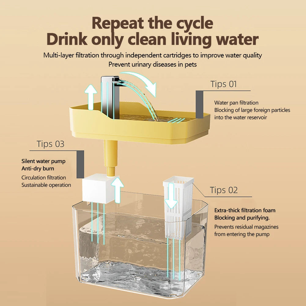 4. Système de filtration continue : Le distributeur d'eau pour chat est équipé d'un système de filtration cyclique qui purifie l'eau en continu, éliminant les impuretés et fournissant à vos animaux une eau fraîche et propre à tout moment. Cela favorise une meilleure santé et réduit le risque de contamination.